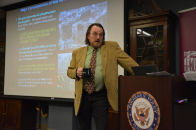 Dr. Preston began by discussing the post-WWII liberal world order that was constructed by the United States, which is now being abandoned by the Trump administration in favor of a Hobbesian, realist approach to foreign policy. He also cites the empty promises made by the U.S. with regards to Ukrainian security guarantees, specifically the 1994 decision for Ukraine to return their nuclear weapons to Russia. Such decisions exemplify the U.S.’s waning commitments to maintaining the liberal world order, which is beginning to fracture. Preston also cited NATO expansion into Eastern Europe as an existential threat from Putin’s point of view, which contributed to the decision to invade in 2022.