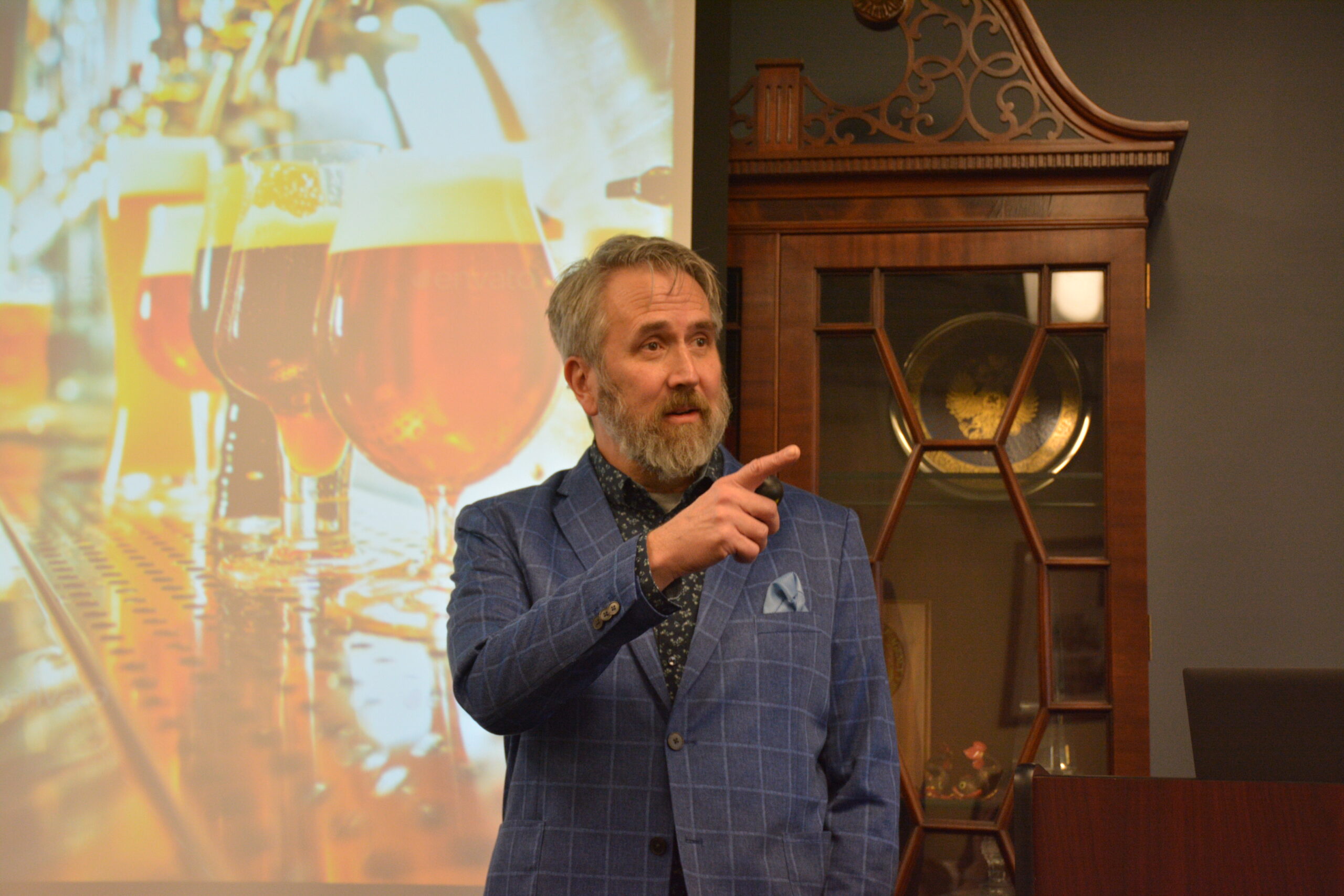 Professor Goldby opened his presentation by addressing the history of beer among both civilization and American forefathers. Quoting Lincoln, Dr. Goldsby mentioned the former President’s belief that the American people, when provided with truth and beer, have the potential to meet any challenge. He then proceeded to discuss the virtues of American democracy that make it worth saving, such as the ability to register both content or discontent with respect to policies through elections, the rule of law, and the reverence for basic rights. Goldsby noted how equity is the goal which democracy aims for, and that like democracy, beer is all equal.